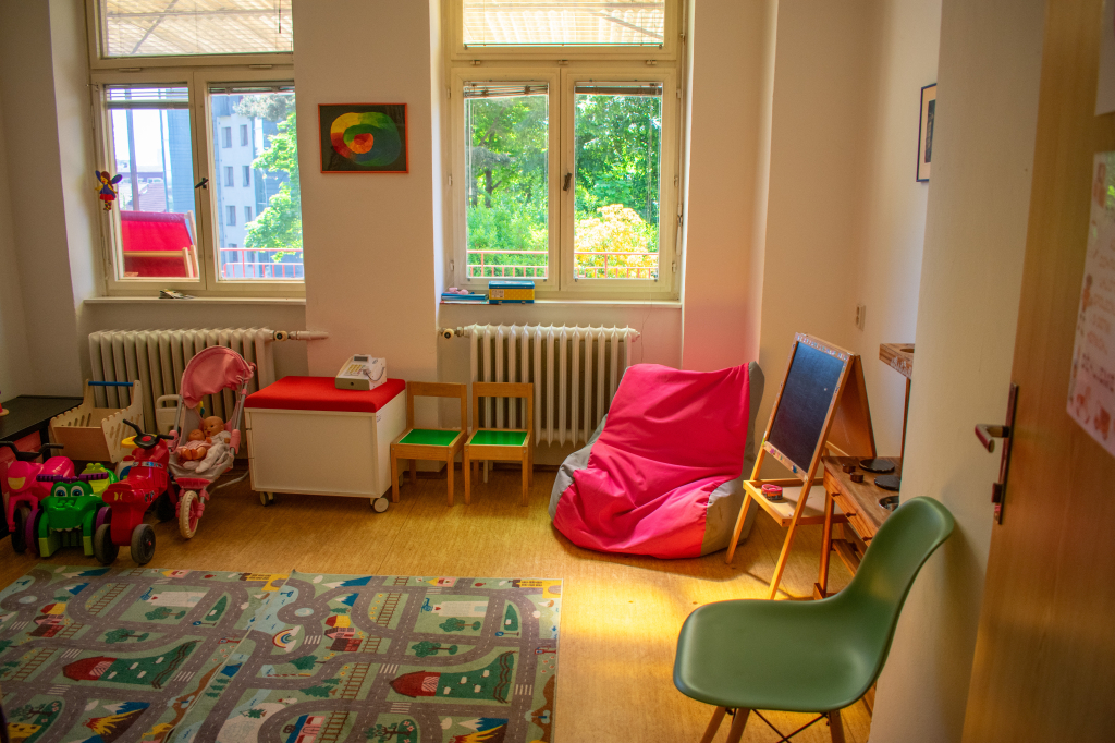 Čekají tu kočárky, odrážedla, tabule, stolní hry, knihy a další hračky, které si navíc můžete půjčit i ven – na zahradu nebo terasu.